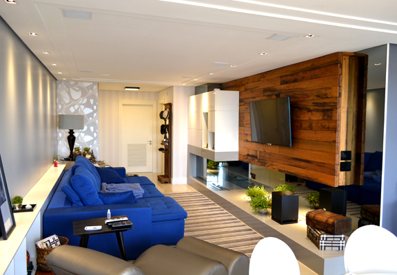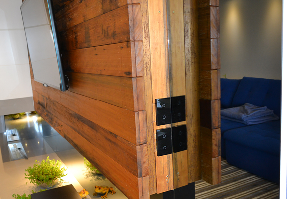 O projeto realizado por Fabricio Zaffari iniciou com a necessidade de ocultar/esconder todos os equipamentos de áudio, vídeo e home theater na sala de TV. Solução essa que valorizou ainda mais o projeto do arquiteto para o painel em madeira reciclada de antigas barricas de vinho, deixando o ambiente clean e sem fios aparentes.