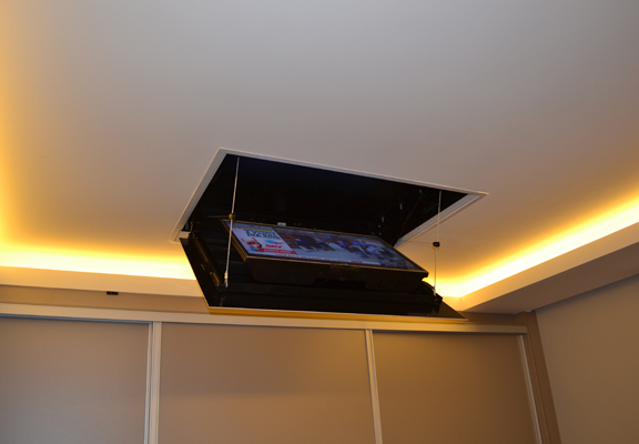 Na suíte a solução para ganhar mais espaço e armários foi o Flap de TV, além de deixar o ambiente mais limpo, a praticidade e angulação negativa quando aberto é ideal para quem gosta de assistir TV deitado na cama.