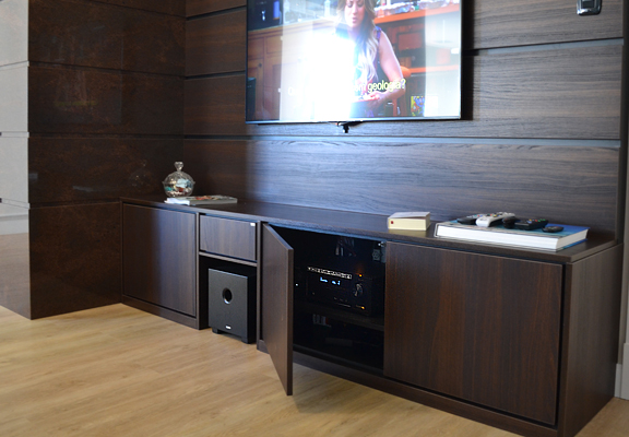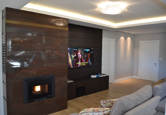 O living integrado recebeu um home cinema 5.1 na sala de TV com caixas embutidas no teto para manter o ambiente clean, assim como o móvel projetado sob medida para esconder os equipamentos de áudio e video, e, sonorização ambiente para os momentos relax, churrasco ou receber amigos.