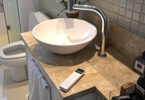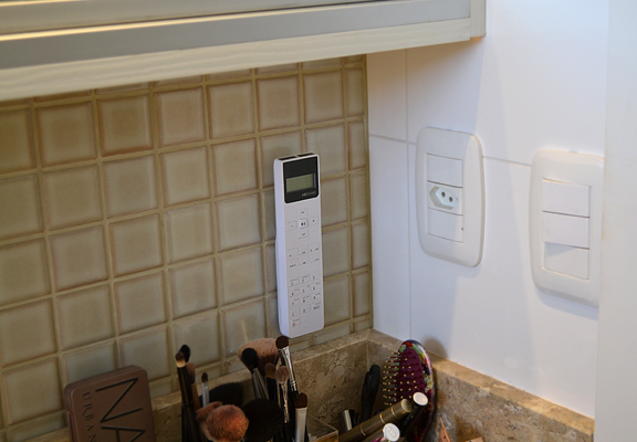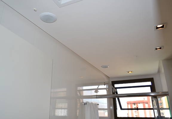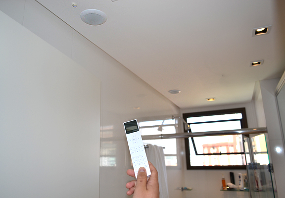 Para sonorização ambiente a opção foi aplicar o sistema sem-fio com bluetooth nos banheiros, devido a dificuldade de passagem da fiação, que atendeu muito bem a forma dos usuários de reproduzirem música pelo smartphone.