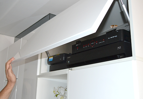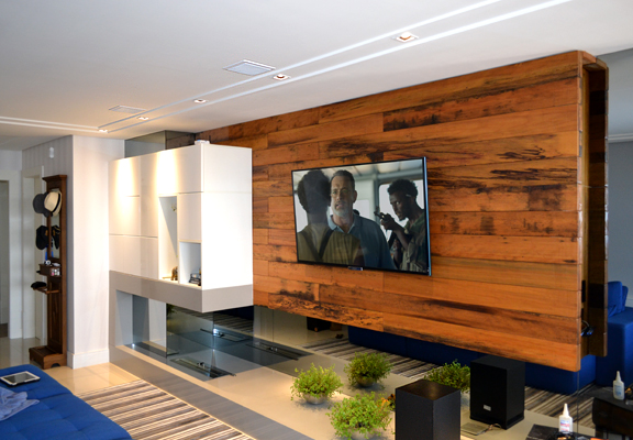 O projeto realizado por Fabricio Zaffari iniciou com a necessidade de ocultar/esconder todos os equipamentos de áudio, vídeo e home theater na sala de TV. Solução essa que valorizou ainda mais o projeto do arquiteto para o painel em madeira reciclada de antigas barricas de vinho, deixando o ambiente clean e sem fios aparentes.