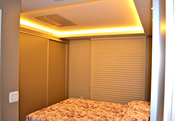 Na suíte a solução para ganhar mais espaço e armários foi o Flap de TV, além de deixar o ambiente mais limpo, a praticidade e angulação negativa quando aberto é ideal para quem gosta de assistir TV deitado na cama.