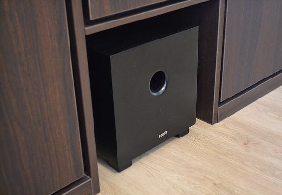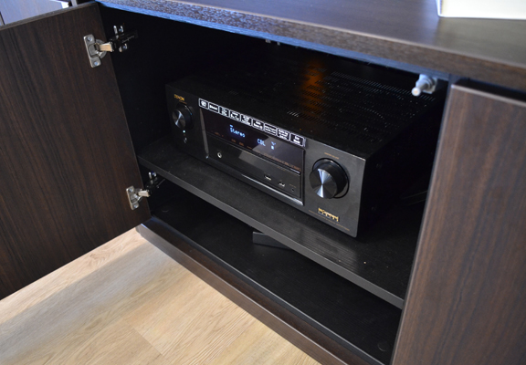 O living integrado recebeu um home cinema 5.1 na sala de TV com caixas embutidas no teto para manter o ambiente clean, assim como o móvel projetado sob medida para esconder os equipamentos de áudio e video, e, sonorização ambiente para os momentos relax, churrasco ou receber amigos.